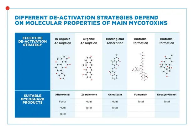 MycoGuard products use a combination of three mitigation methods to de-activate mycotoxins and support animal health and performance. De-activation method depends on the chemical properties of the mycotoxin.