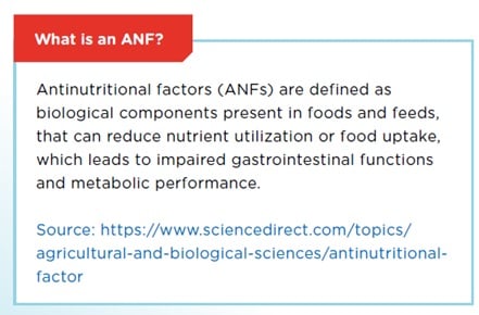 Different raw materials also have different ANFs. In wheat for example, the non-starch polysaccharide (NSP) content is high. The right NSP enzymes need to be added at the correct dosage to support the gastrointestinal tract in properly digesting these NSPs without viscosity challenges or preventing the bioavailability of essential nutrients.