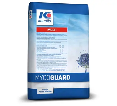 Zearalenones, ochratoxins and aflatoxins pose a health risk to animals. MycoGuard Multi effectively captures and binds these mycotoxins. Its active ingredients consist of a specific yeast cell wall product. It also contains bentonite which further immobilizes zearalenones and ochratoxins and effectively de-activates aflatoxins. MycoGuard Multi can be added to the diets of poultry, swine, ruminants and aqua.