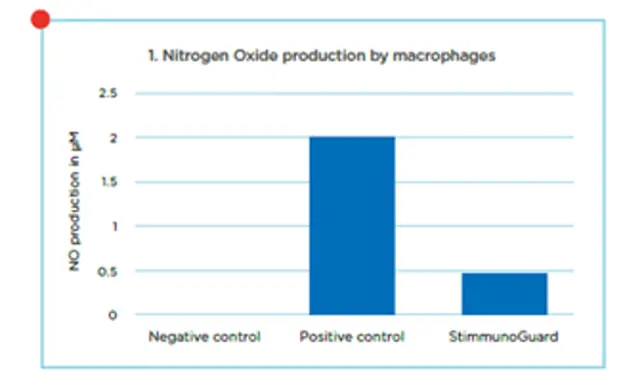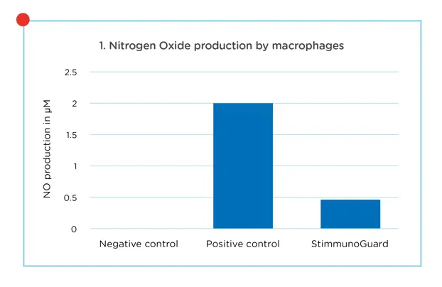 To verify the immune stimulating properties in-vitro trials were conducted at Wageningen University. The responses of macrophages, white blood cells that belong to the innate immune system showed macrophage Nitrogen Oxide (NO) production and phagocytosis activity. These can be considered as biomarkers showing that StimmunoGuard stimulates these cells of the immune system.