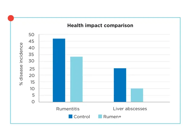 Feedlot trials with high-concentrate diets showed that TopGuard Rumen+ helped reduce cases of liver abscesses and rumen inflammation. The graph shows the positive effect on 20 months old Nellore bulls during a 123 days trial using 1g/kg of dry matter intake at Instituto de Zootecnia.