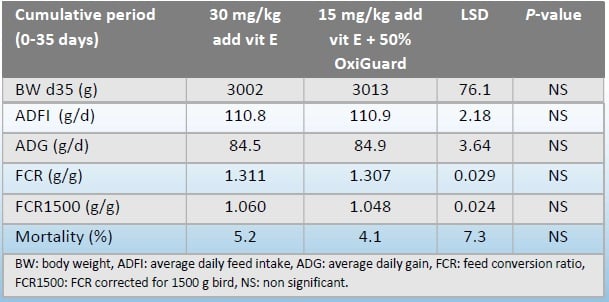 Table 1. Performance data of broilers fed a diet with 30 mg/kg added vitamin E versus a diet with 15 mg/kg vitamin E + 15 mg/kg vitamin E equivalent added in the form of OxiGuard.