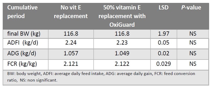 Table 2. Performance data of grower finisher pigs fed a diet with 30 mg/kg added vitamin E versus a diet with 15 mg/kg vitamin E + 15 mg/kg vitamin E equivalent added in the form of OxiGuard and fed a diet with 100 mg/kg added vitamin E versus a diets with 50 mg/kg vitamin E + 50 mg/kg vitamin E equivalent added in the form of OxiGuard. Results are presented as averages.