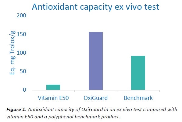 The effectiveness of OxiGuard was tested and validated in several studies. Below we present key validation results from our most important studies, demonstrating the proven antioxidant performance and reliability of OxiGuard. Figure 1 shows the antioxidant capacity of OxiGuard compared with vitamin E50 and a benchmark polyphenol product in an ex vivo red blood cell assay. In this test, red blood cells were stressed with light, and their half-life was measured and expressed in Trolox equivalents as the read-out parameter. A higher value indicates a better antioxidant capacity. The results demonstrate that OxiGuard outperformed both vitamin E50 and the benchmark product, indicating that OxiGuard provides a very strong antioxidant effect in this ex vivo model.