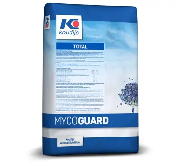 The most common mycotoxins that negatively affect livestock include aflatoxins, ochratoxins, fumonisins, zearalenones and deoxynivalenol. MycoGuard Total is a complete product that deactivates a broad spectrum of mycotoxins and provides additional security against them. The combination of bio-transforming enzymes, a strongly binding yeast cell wall product and bentonite clay forms an effective line of defense against mycotoxins. Suitable for use in poultry, swine and ruminant feed, it has been fully tested to deliver maximum performance.