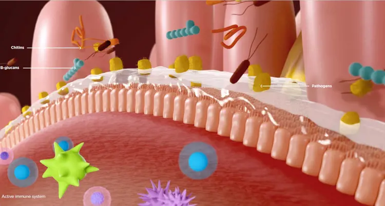 Besides the immunomodulating properties of beta-glucans present in high quantities, a high percentage of chitin in the fungal mycelium cell membranes may have contributed to StimmunoGuard’s effectiveness as well. Literature states chitin is an immune modulator which acts similarly to beta-glucans. Predominantly active in the intestinal tract, chitin can be recognised by PRRs on various innate immune cells triggering an immunomodulatory response. In addition, when chitin is broken down in the intestinal tract of animals it produces chitosan which can damage the cell membrane of harmful microbes. Here too, the level of polymerisation, molecular weight and branching influence biological activity. Further research is ongoing to further characterize the chitin immunomodulatory effects.